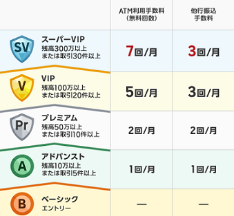 | 預金残高 | 他行振込無料回数 | ATM無料回数 |