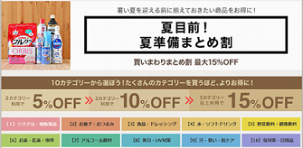 10種類程度のカテゴリの商品を5種類購入すると「まとめ割」の15%割引が適用されます。
