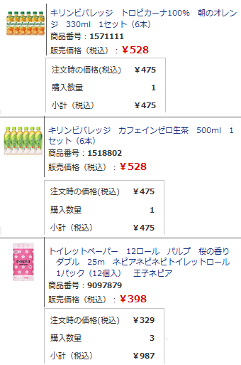 キリン生茶は1本あたり約67円、トイレットペーパー1セット(12ロール)は約279円となります。