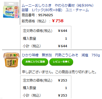 赤ちゃんのおしりふき(80枚×8セット)は 約547円、無添加の減塩みそは約215円となります。