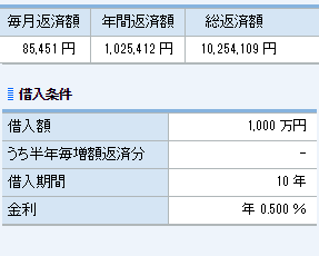 10年間の合計では約965万円となり、借り入れした 1,000万円よりも 35万円も少ない金額になっています。
